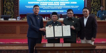 Pada kesempatan tersebut, Gubernur Al Haris bersama Ketua DPRD Provinsi Jambi M. Hafiz menandatangani persetujuan Perubahan APBD Tahun Anggaran 2025, disaksikan Wakil Ketua dan anggota DPRD lainnya.